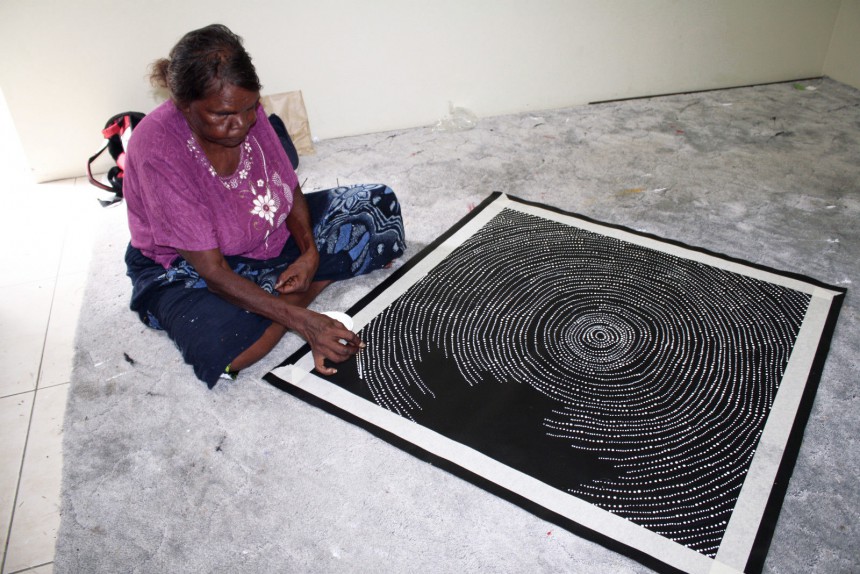 Dorothy Napangardi : (1950-2013) est née dans le bush du désert de Tanami à environ 400 km au Nord-Ouest d’Alice Springs. Elle est aujourd’hui considérée comme l’un des grands leaders de ce mouvement d’Art Aborigène contemporain.