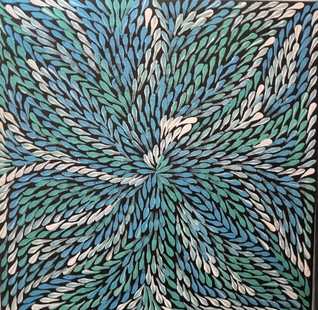 Bush Flower bleu évoque les feuilles d’Igname plus communément appelées Yam. Ces plantes jouent un rôle très important pour les femmes Anmatyerre.