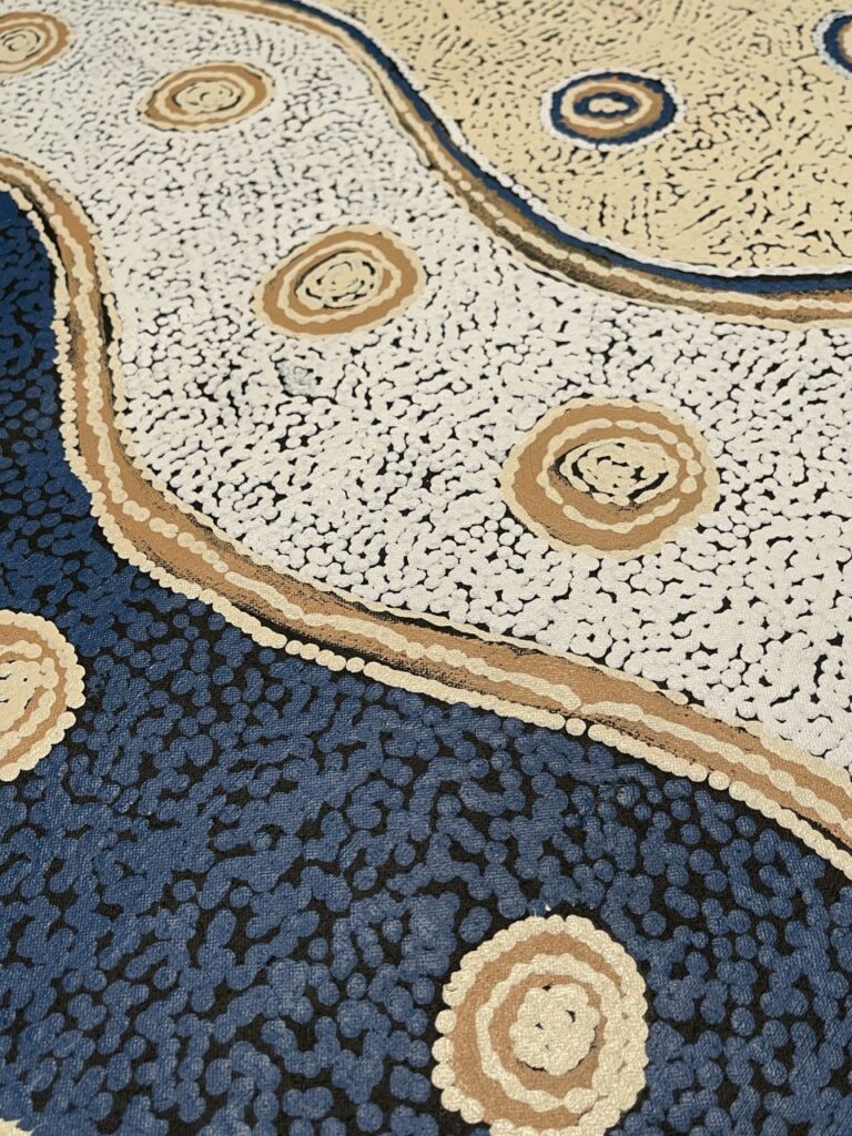 This Jukurrpa comes from Mina Mina, a very important women’s Dreaming site far to the west of Yuendumu near lake Mackay and the WA border. The « Kirda » (owners) of this Dreaming are Napangardi/Napanangka women and Japangardi/Japanangka men; the area is sacred to Napangardi and Napanangka womeon. There are a number of « mulju » (water soakages) and a « maluri » (clay pan) at Mina Mina.